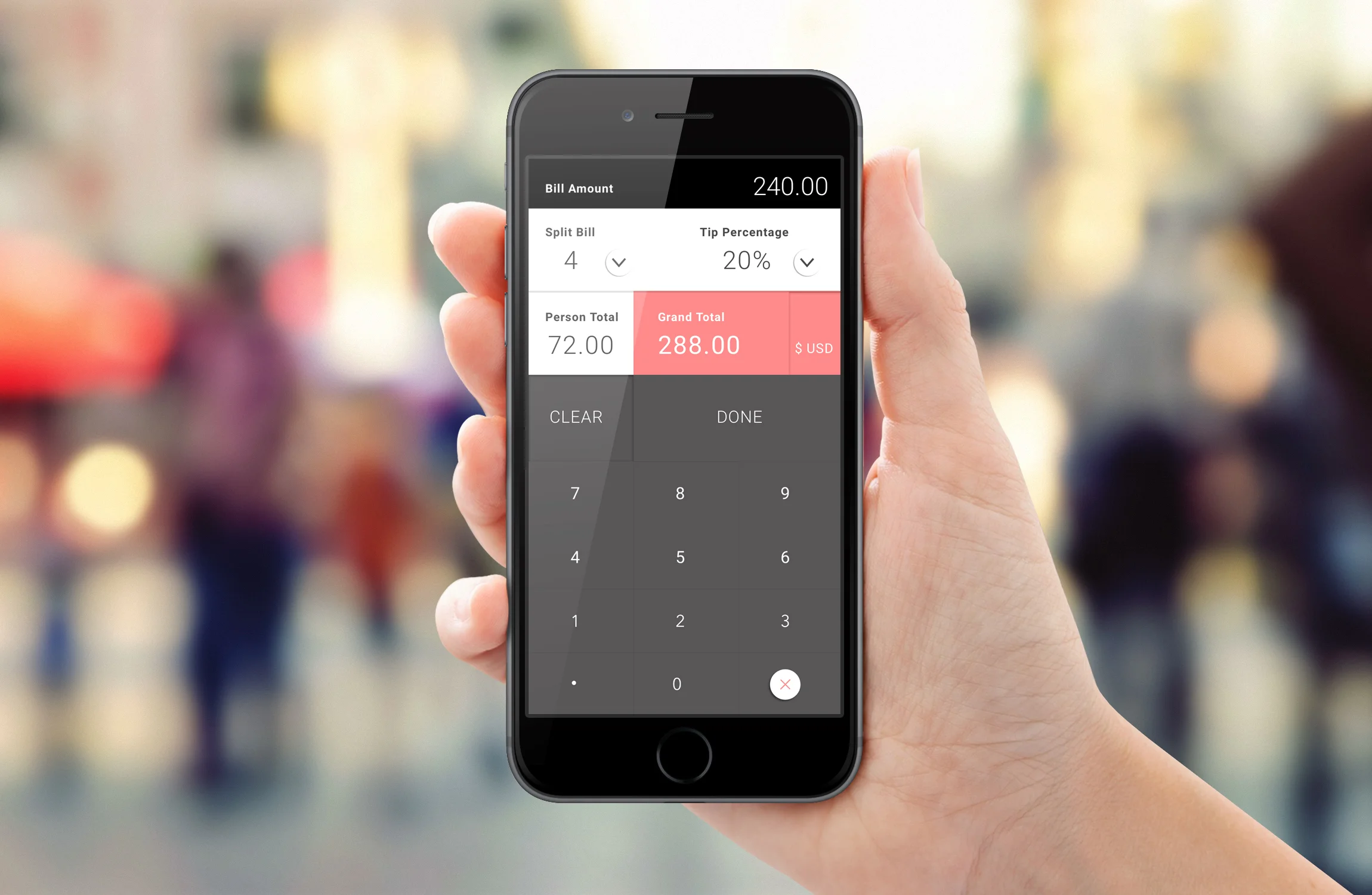 When I saw today’s challenge, I knew what exactly I would like to design. I’ve been using an app to calculate the tip amount and been thinking what if I can create how user interface to be more attractive and be used effectively when you need to solve the problem. Tip amount and how many people you would like to split could be adjusted by tapping and select suitable number. You can also change your system of money in general use in a particular country.