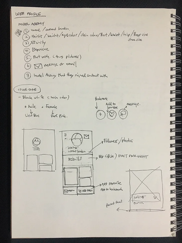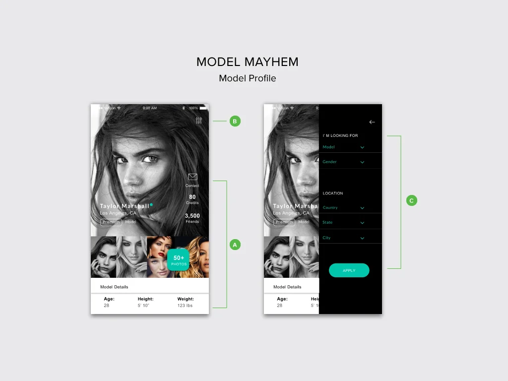 I decided to create a profile of modelmayhem since I've been using it when I'm looking for a model for my work. When opening their site both desktop and website has lots of content, and several levels of navigation and both are not easy to navigate; it seems a bit chaotic and does not appeal to look at it. The primary purpose of the model profile is to attract and grab users attention. Therefore, I would like users to have an experience by allowing them to easily see where they are, how they got information, and where they can go. A. The user will give the necessary pieces of information such as model name, location, photos, credit (liability) of a model. B. and C. Filter icon on the right allows a user to narrow down their search if they are looking for photographer, Male model also if they prefer any particular location. As a brand image, I still use their color scheme, which is black and green, to remind visitors when they are visiting the website.