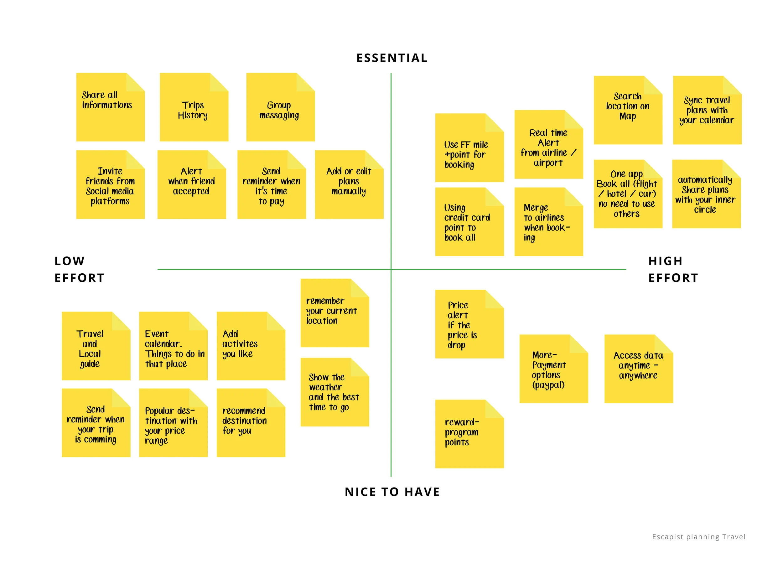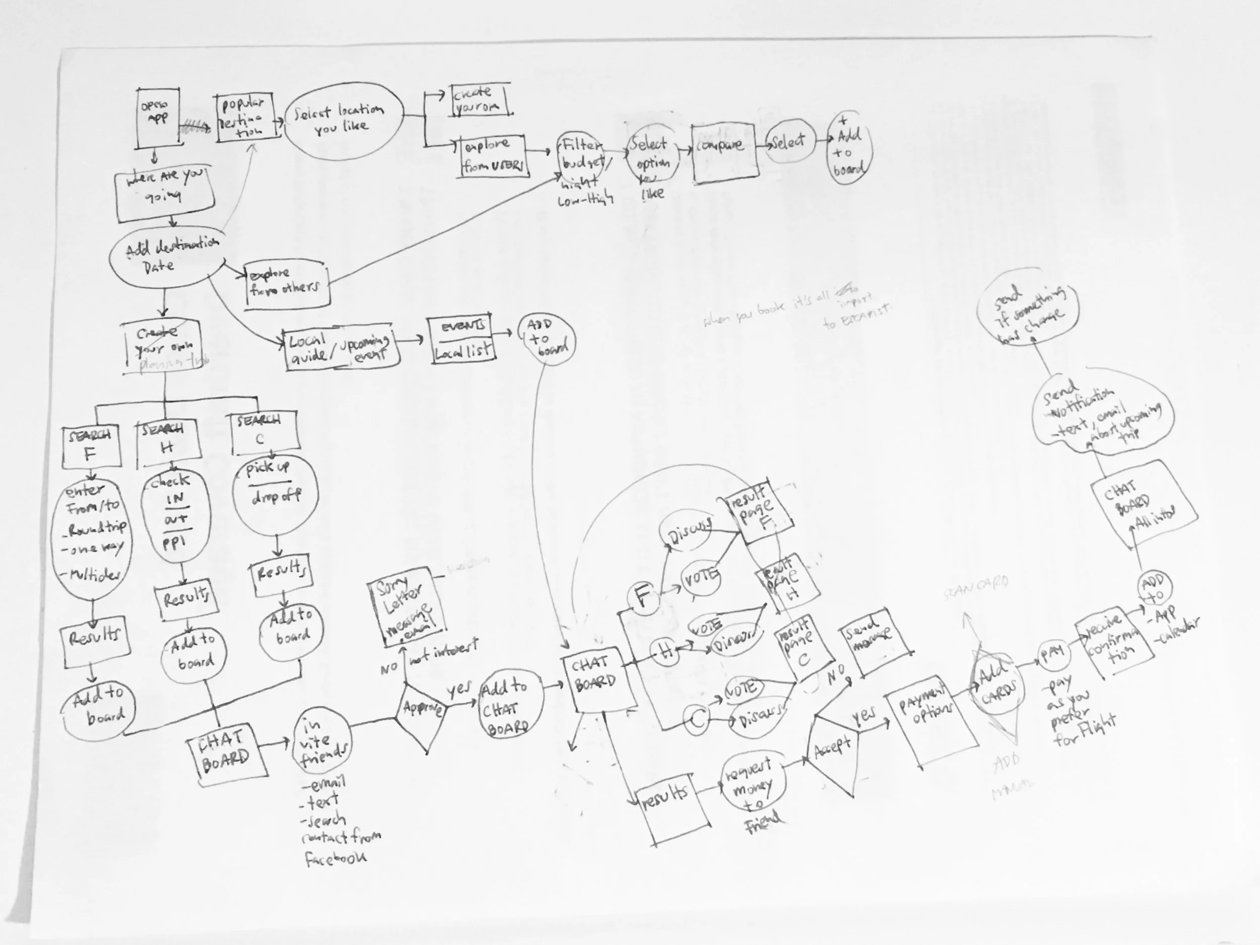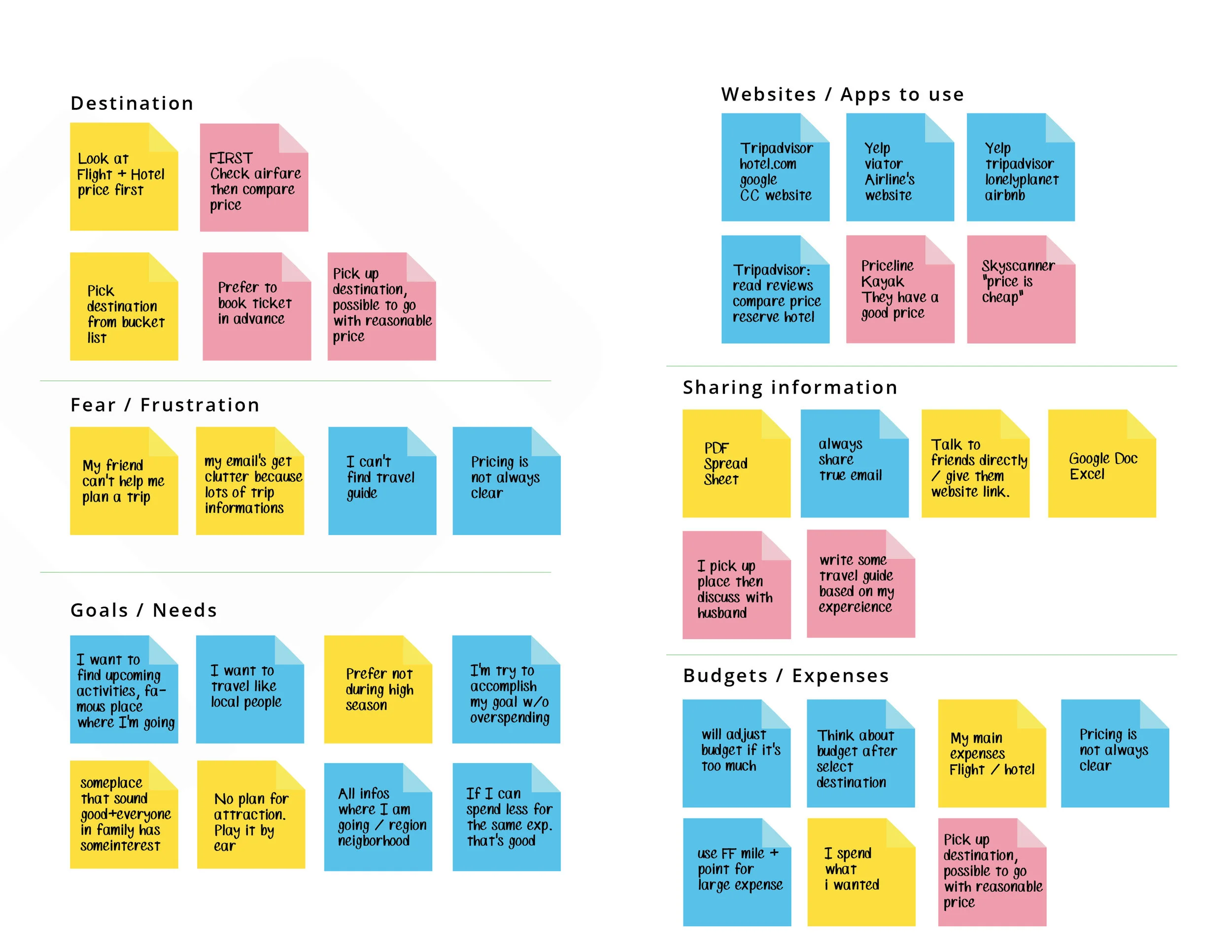 As I started to sketch and created an early wireframe based on the interview results, I have failed to accomplish my goal that I wanted to solve the problem. I paid too much attention to the additional area of concern, how the layout would be displayed, and how is going to look. I hadn’t thought about the priority that users need to see, how can they share the trip, collaborate with friends until they have a commitment, “ How would they do that?” I know that destination is the first thing that is concerned with interview results but “how about other processes that can bring users successfully booking a trip?” To define the core problem, I have to think carefully and identify up to a point, so I tried to put together the information I have created and carefully gathered.