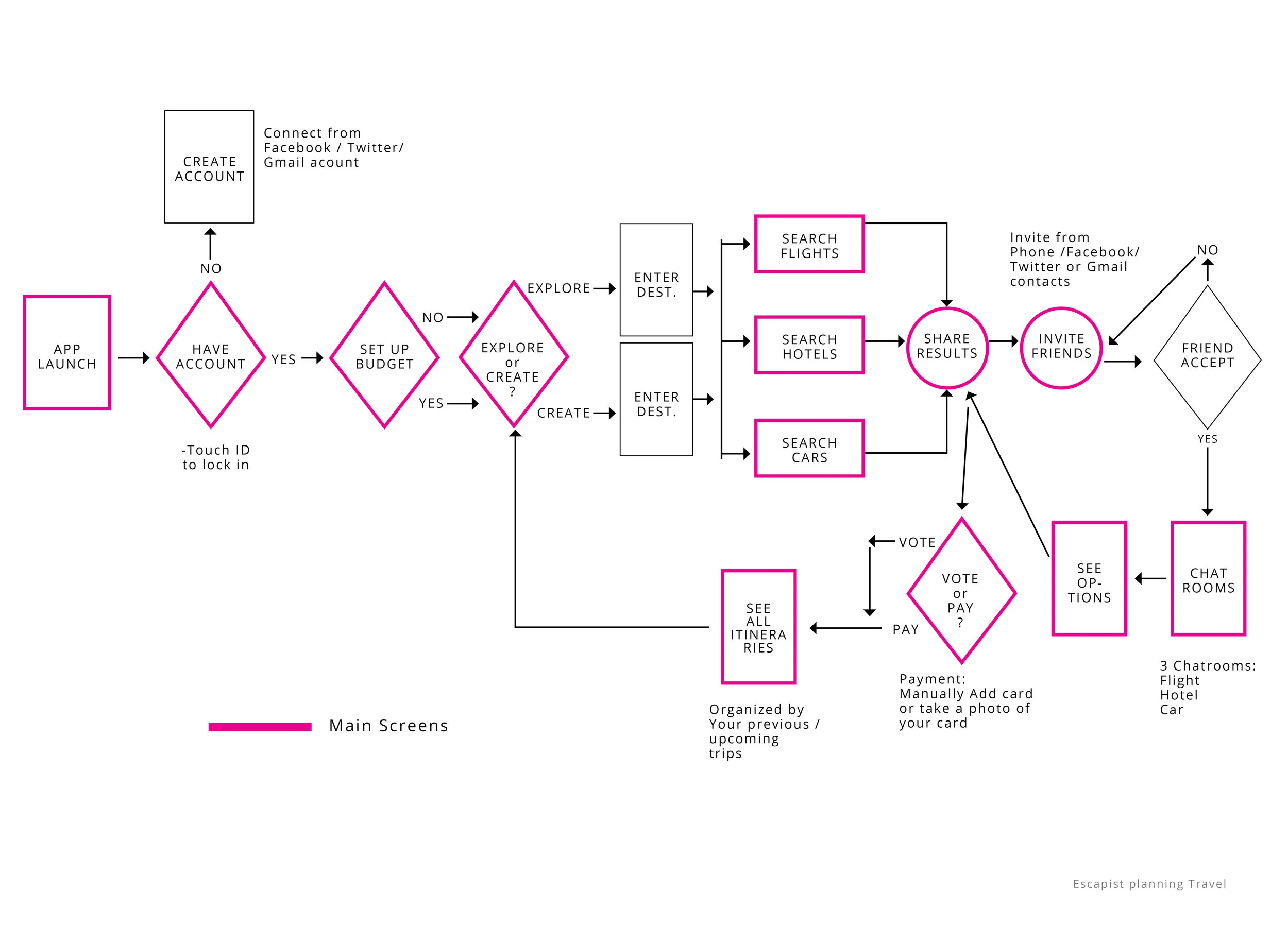 Before I begin the visual design process, I wanted to highlight what users need and show what is being considered the most for them. From the interview result, the destination is the priority. So from there, the main actions that users will interact would be a plan or create a trip, preferred destination, set up a budget (optional), invite, share with friends until they decide to go the trip together.