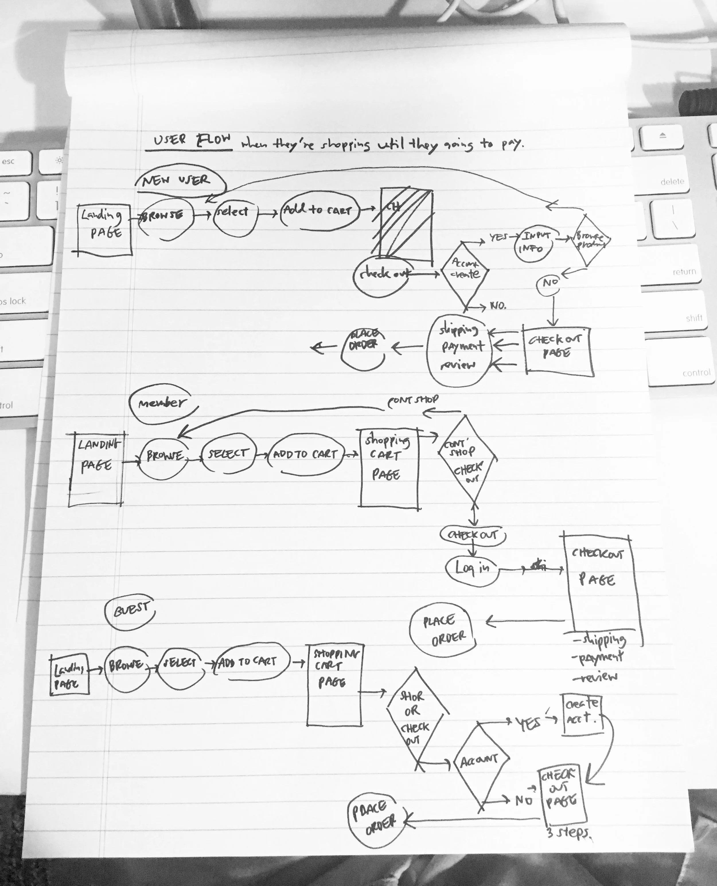 We tested the existing shopping cart and check out page with 3 participants, who they are our customers at our flagship store, in the most problematic online purchasing from start to finish. User testing sessions involve 3 participants, a computer or mobile device, and myself who provides the participants with details to complete. For having an ability to make a rational judgment while they are shopping, I take lavish notes by keeping my eyes peeled of issued, observed their ability to measure how do they accomplish their goal as an online customer and what problem matter. Before I could jump into designing, I create user flow, define the problem to understand customer insight when they are shopping. So I take a screenshot to understand the frustration that participants experience with our site.