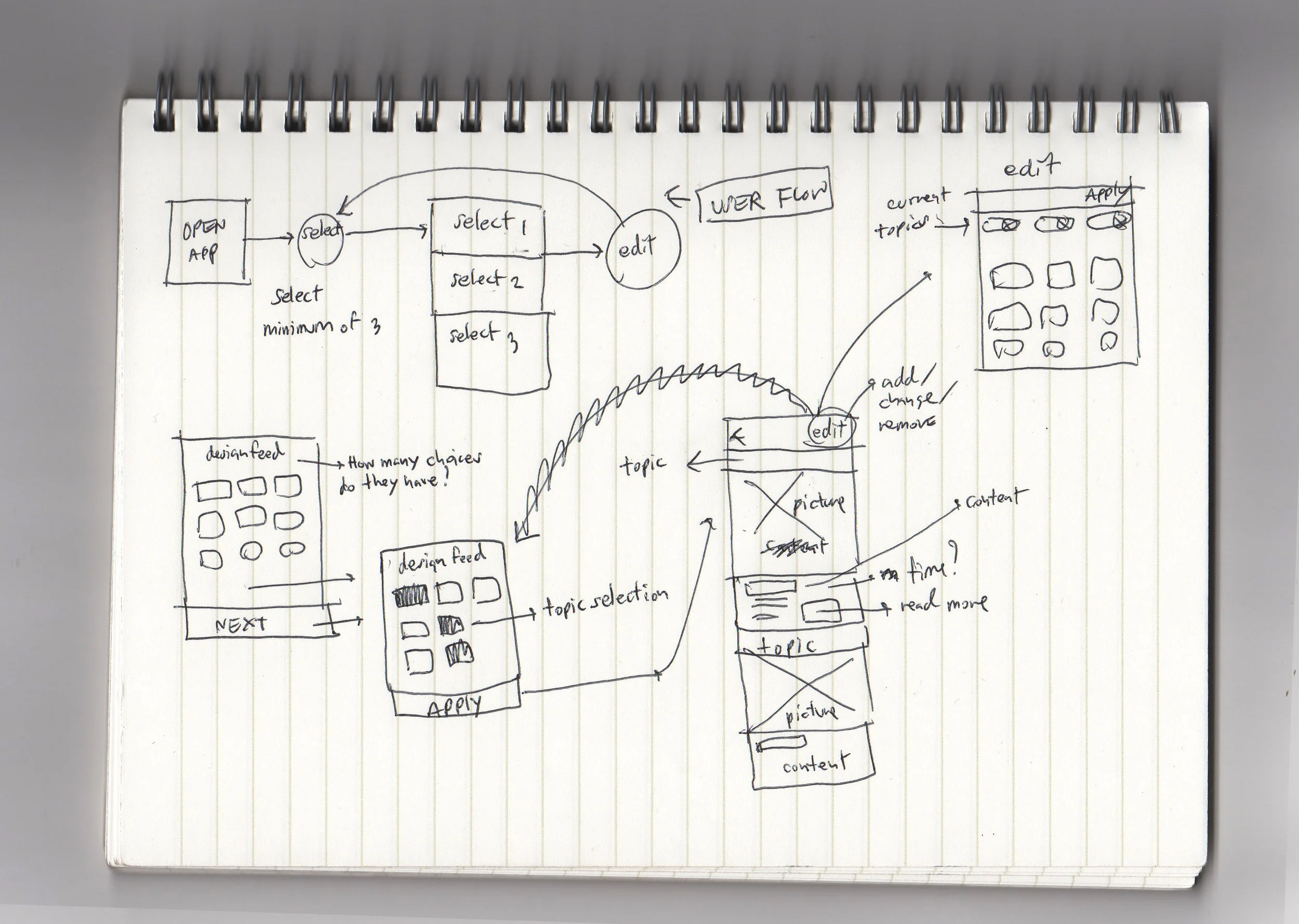Before I could jump into designing, I create user flow, define the problem to understand customer insight when they are selecting topic—> read—> edit ( add or remove ).